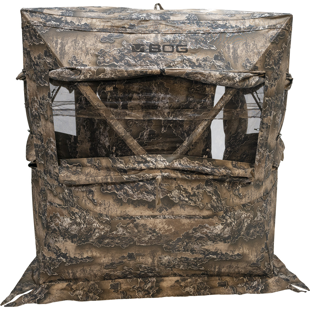 The BOG Prevail Ground Blind features a traditional 5-hub design that accomodates 2 hunters. The blind incorporates various hunter-friendly features including UV protected fabric, StealthZip silent zippers, 360 degree curtain windows, StealthTrac silent window technology, and 360 degree brush loops.
