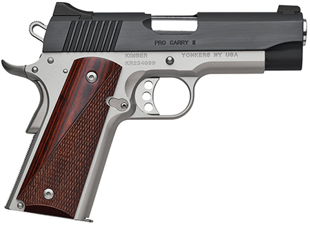 The Kimber Pro Carry II Two-Tone is a compact, 1911-inspired semi-automatic pistol built for carry and target work. It combines a stainless match-grade barrel with a brushed black slide and a satin silver aluminum frame for a durable two-tone finish. Rosewood grips and a low-profile sight set complete the presentation for shooters seeking classic ergonomics in a carry-sized package.