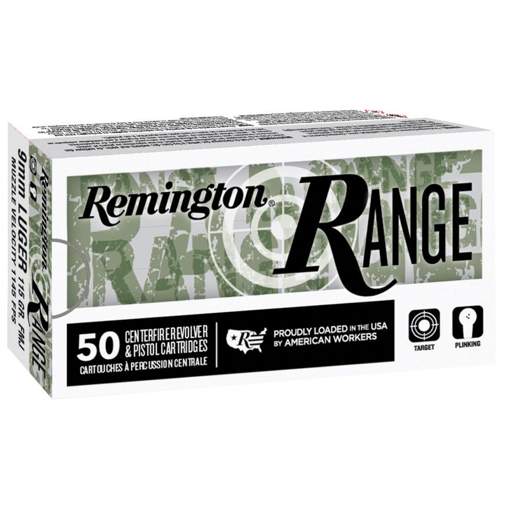 This Remington RANGE brass cased ammunition in 9mm Luger comes in full metal jacket at 115 grains and attains 1,150 FPS and 338 FT-LB.