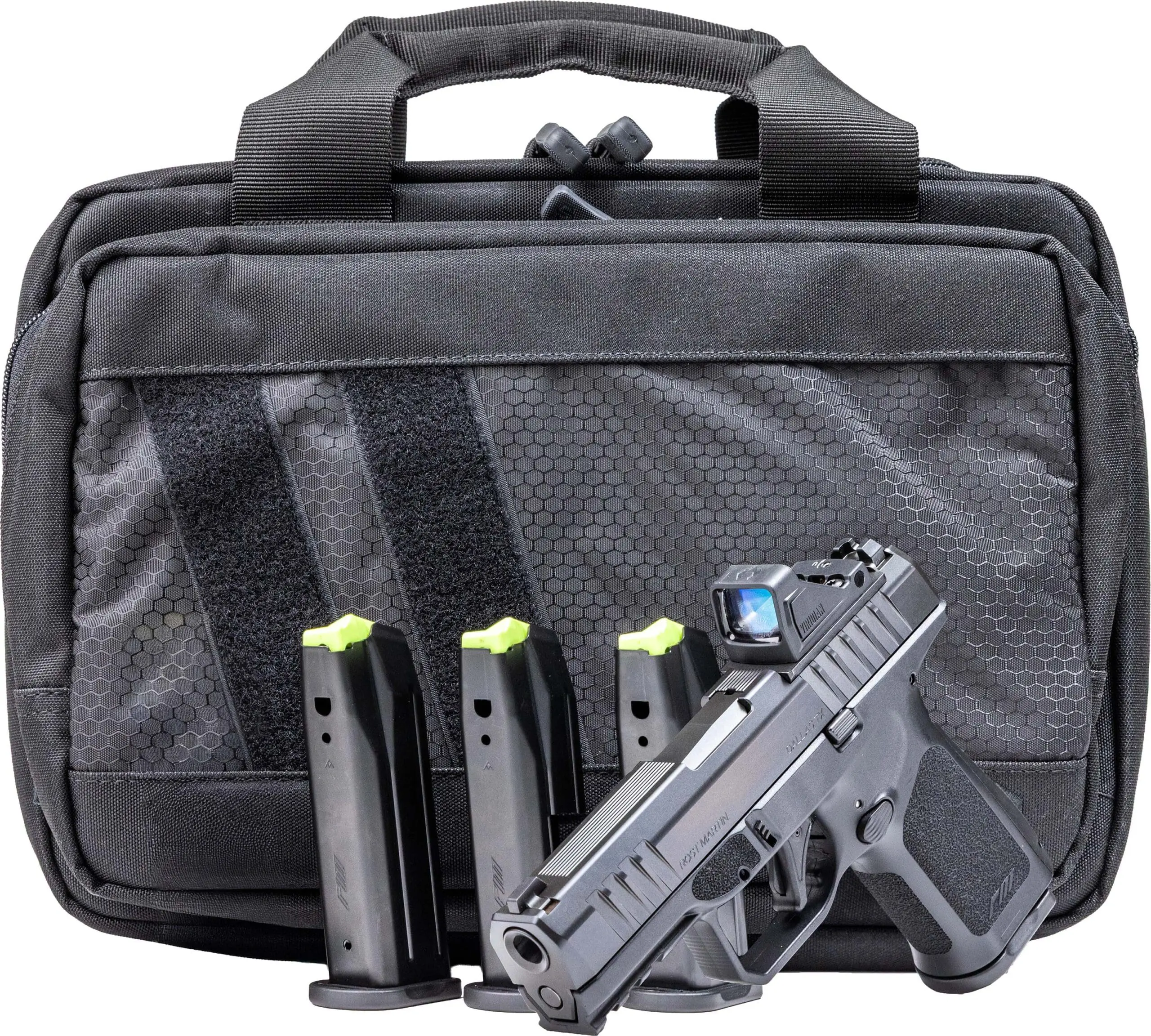 The Rost Martin RM1C is a compact, striker-fired pistol configured for practical use in everyday carry, range sessions, and household protection. It pairs a 4-inch barrel with a compact polymer frame and a nitrocarburized finish to balance durability and concealability. This listing is a bundle that includes five magazines to support sustained range time and readiness.