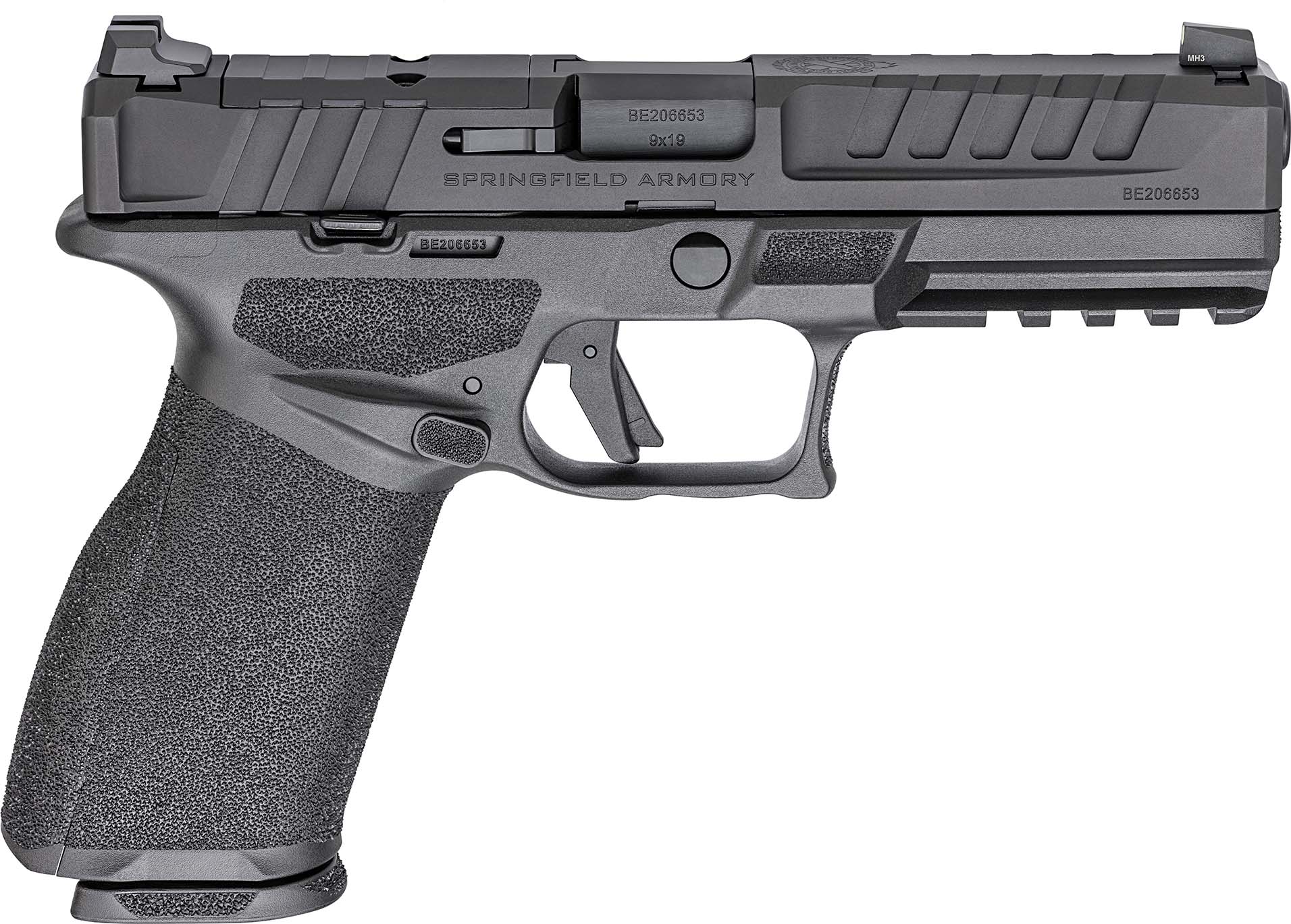 The Springfield Armory Echelon is a modern, striker-fired 9mm pistol built around a stainless steel chassis and a user-focused ergonomic design. It ships with three-dot tritium sights and a dedicated optics mounting system, and is configured with a 4.5-inch barrel and a 10-round magazine capacity.