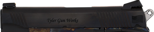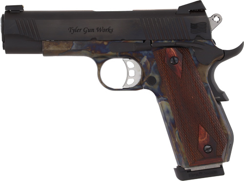 The Tyler Gun Works TGWCMCC45 is a custom 1911 Commander chambered in .45 ACP featuring a 4.25″ stainless match-grade barrel. It combines a blued, serrated steel slide with a color case hardened frame and walnut grips for a traditional aesthetic. The pistol ships with a 7+1 capacity and an extended beavertail for improved control.